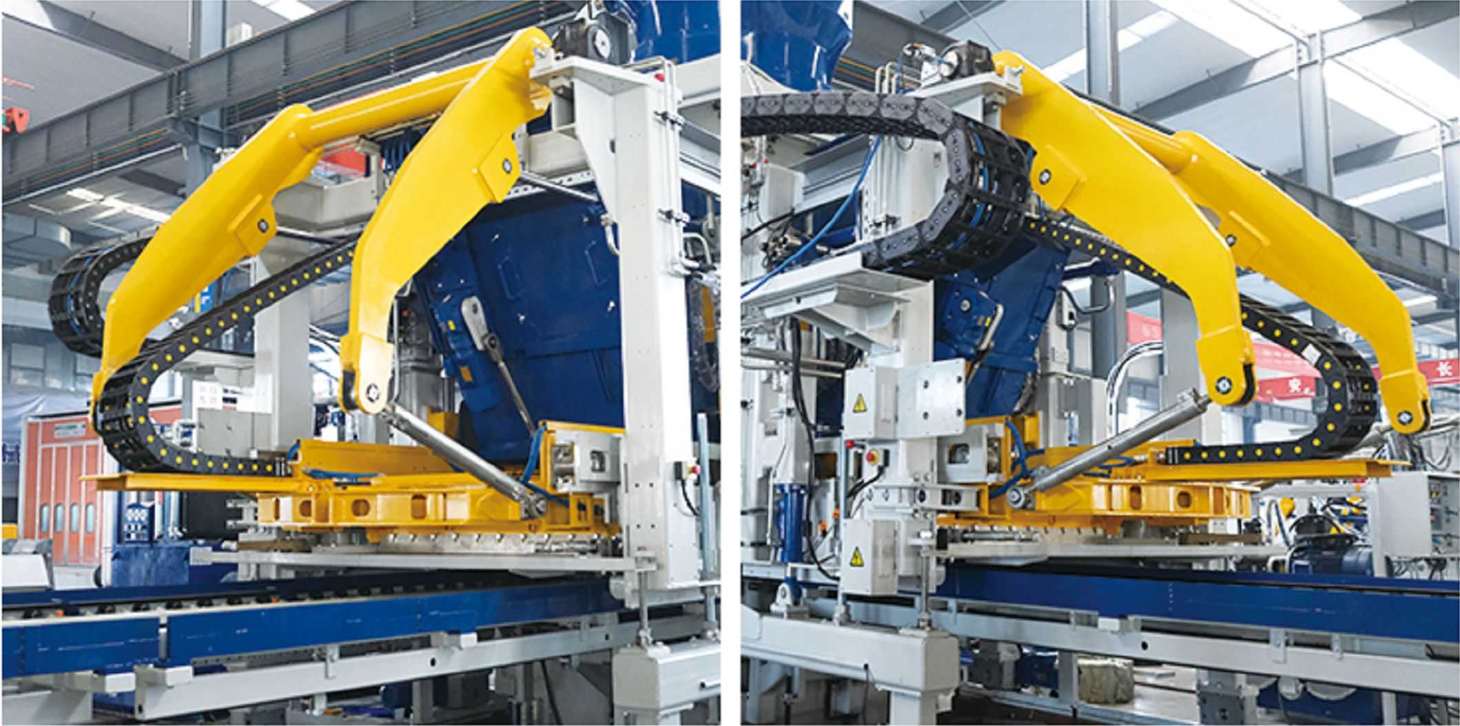 ઉચ્ચ ગુણવત્તાની ફ્રેમ ડિઝાઇન: મુખ્ય ફ્રેમ પેટન્ટ ટેક્નોલોજી સાથે ડિઝાઇન કરાયેલ ઉચ્ચ-શક્તિવાળા વેલ્ડેડ ફ્રેમ સ્ટ્રક્ચરને અપનાવે છે, જે ખાસ સ્ટીલ દ્વારા વેલ્ડ કરવામાં આવે છે. ફ્રેમની ઉચ્ચ ગુણવત્તા અને ઉચ્ચ સ્થિરતાને સુનિશ્ચિત કરવા માટે સમગ્ર ફ્રેમ વૃદ્ધત્વના વાઇબ્રેશન ટ્રીટમેન્ટને આધિન છે. તે ઉચ્ચ ચોકસાઇ સાથે આધાર અને માર્ગદર્શક તરીકે મોટા-વ્યાસના સ્તંભોનો ઉપયોગ કરે છે. સ્ટ્રિપિંગ મિકેનિકલ સિંક્રોનાઇઝેશન, ચોક્કસ ડિમોલ્ડિંગ અને તૈયાર ઉત્પાદનોની ઉચ્ચ સુસંગતતાને અપનાવે છે.